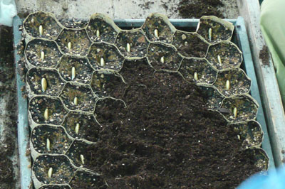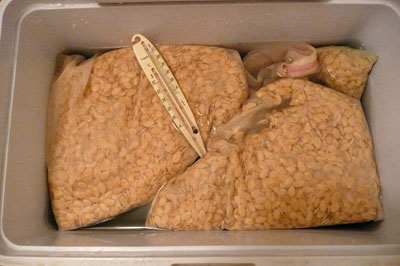 芽出しをするため、32度のぬるま湯に約12時間つけて、種に水分を与えます。